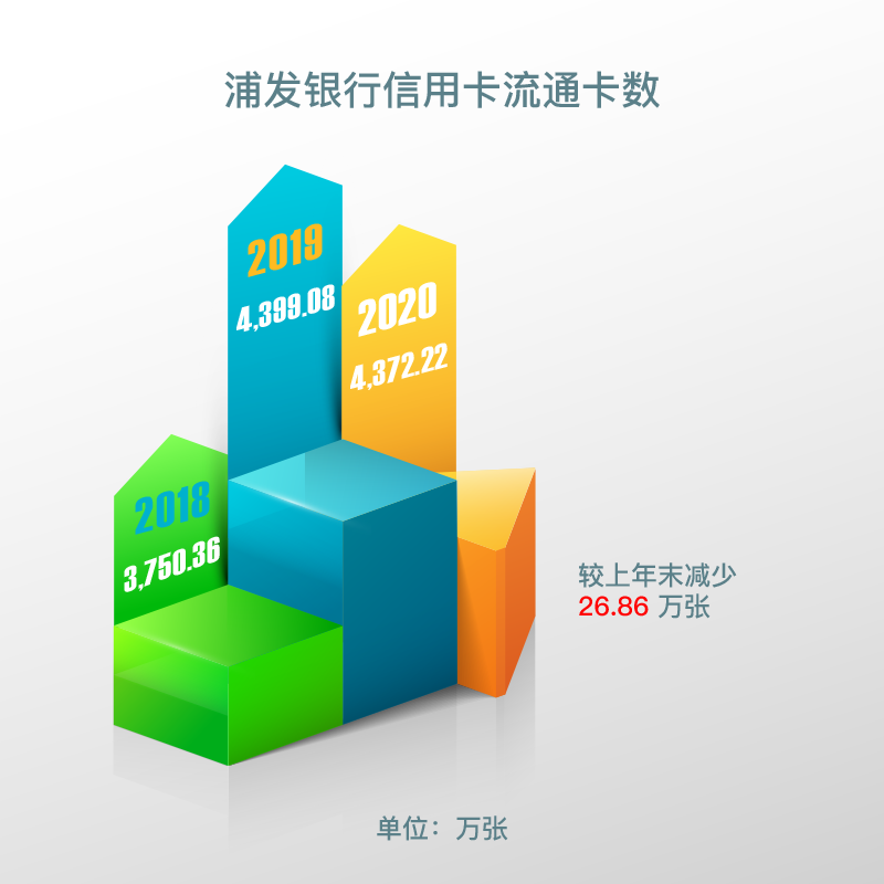 截至2020年末,浦发银行信用卡流通卡数 4,372.22万张,较上年末减少0.61%;流通户数 3,157.40万户;较上年末减少1.49%;截止2019年末浦发银行信用卡流通卡数4,399.08万张;截止2018年末,浦发银行信用卡流通卡数3,750.36万张。