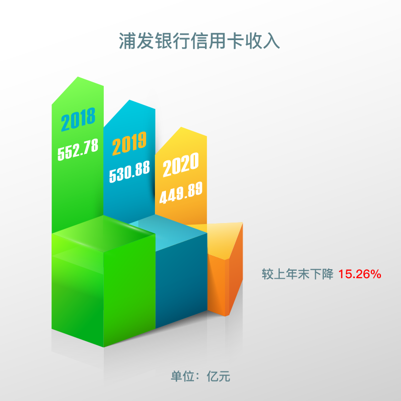 截至2020年末,浦发银行信用卡业务总收入 449.89 亿元,较上年末下降15.26%;截止2019年末浦发银行信用卡业务总收入530.88 亿元;截止2018年末浦发银行信用卡总收入552.78亿元。