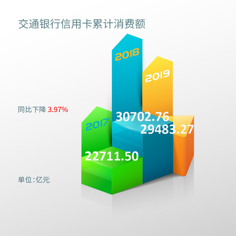 报告期内,交通银行信用卡累计消费额29,483.27亿元,同比下降3.97%, 2018年交通银行信用卡累计消费额30,702.76亿元,2017年交通银行信用卡累计消费额22,711.50亿元。