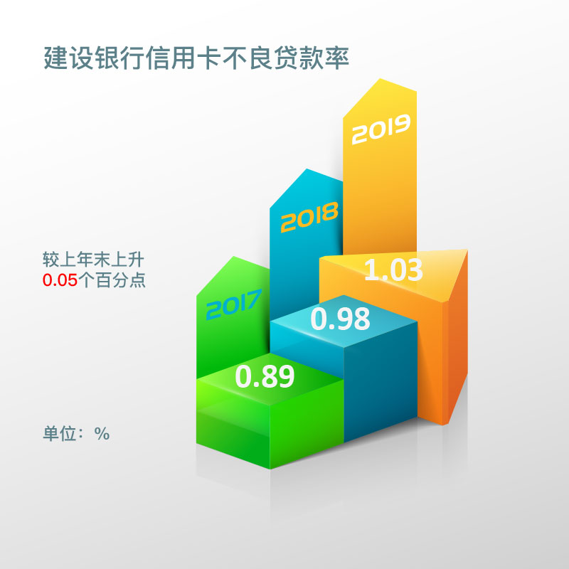 截至报告期末,建设银行信用卡不良贷款率为1.03%,较上年末上升0.05个百分点。截至2018年末建设银行信用卡不良贷款率为0.98%,截至2017年末建设银行信用卡不良贷款率为0.89%。