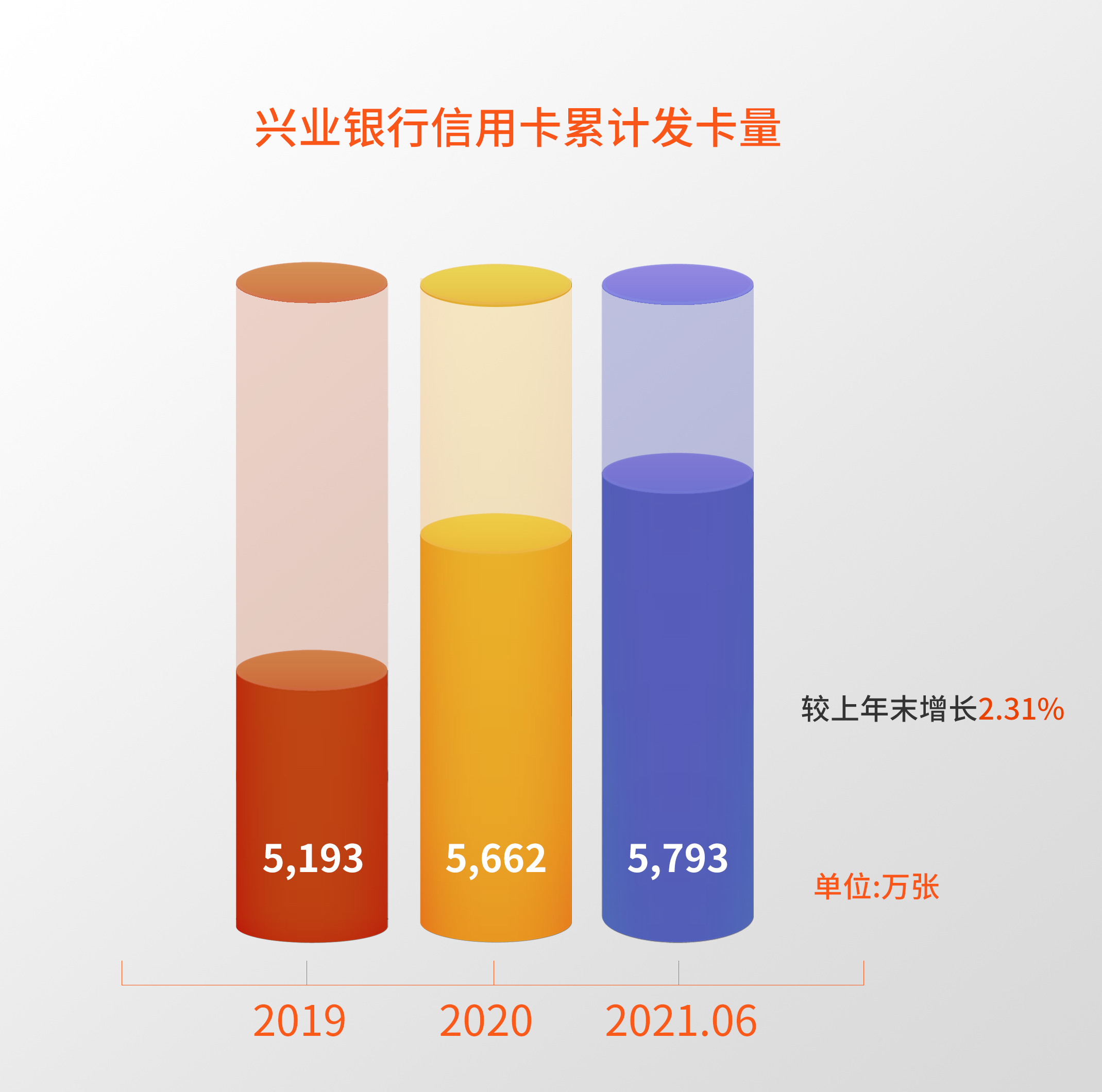 截至2021年6月末,兴业银行信用卡累计发卡5,792.81万张,较上年末增长 2.31%,报告期内新增发卡 130.56 万张。