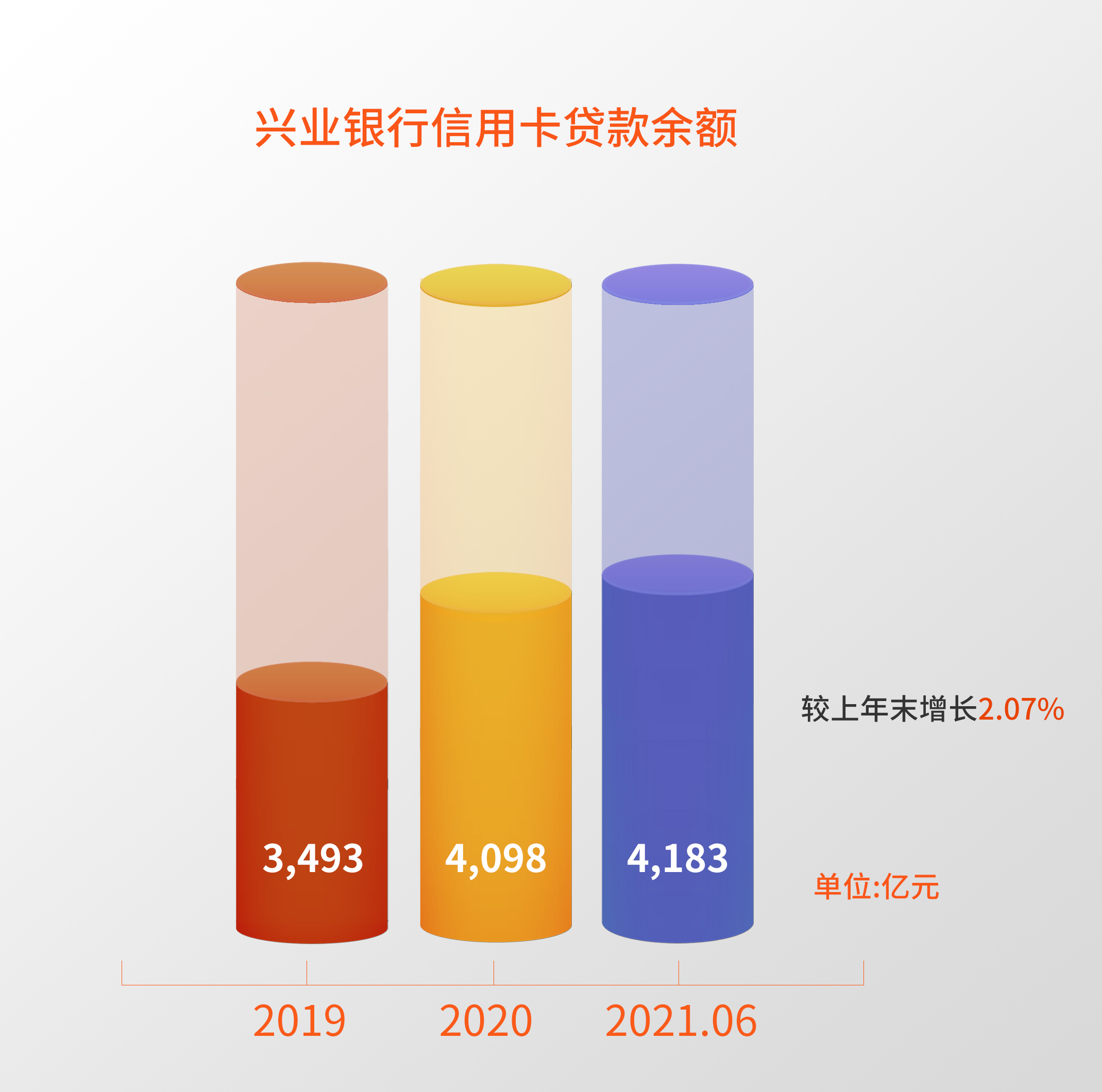 截至2021年6月末,兴业银行信用卡贷款余额4,182.93亿元,较上年末增长 2.07%。