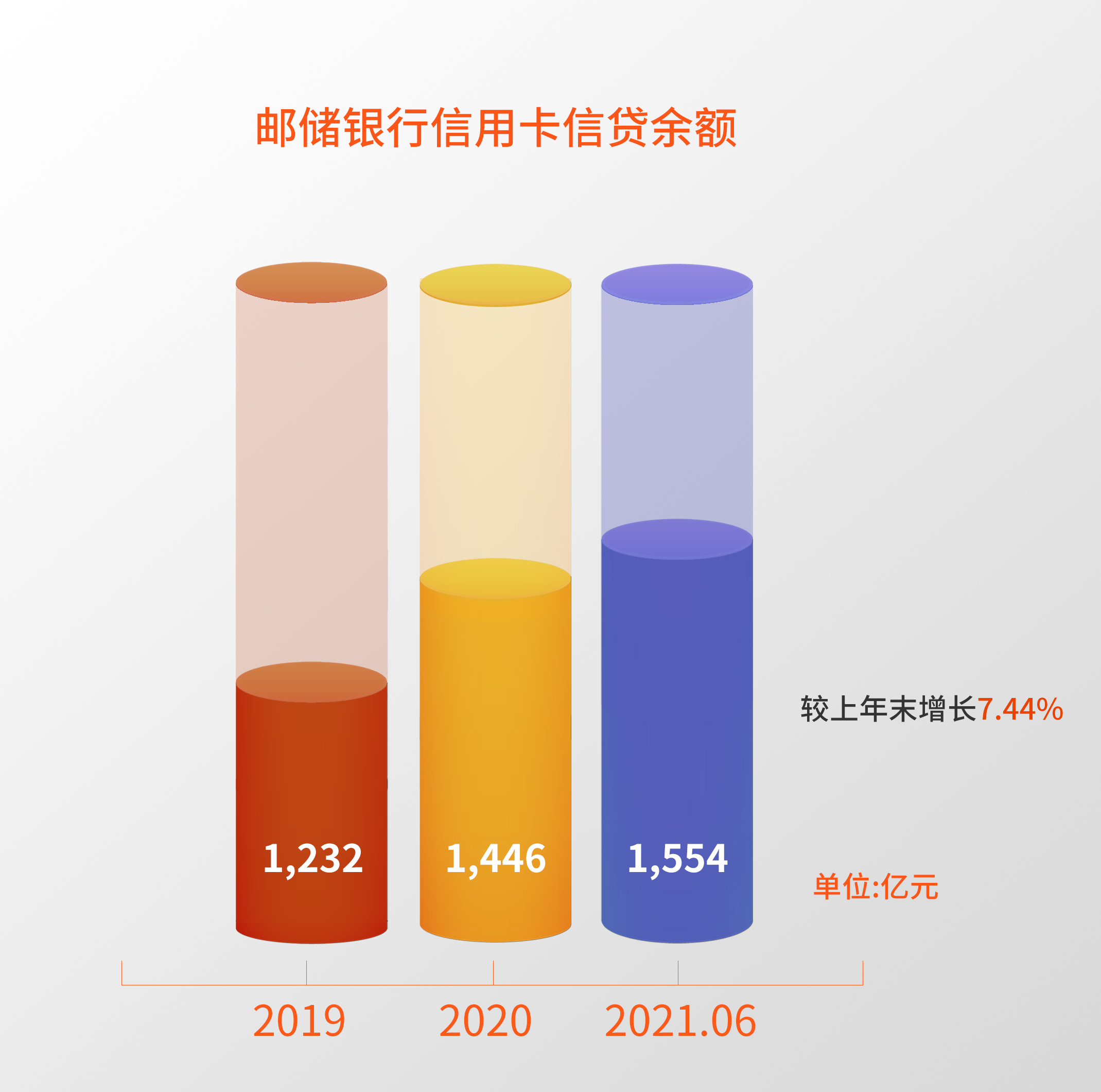 截至2021年6月末,邮储银行信用卡信贷余额1,554.00亿元,较上年末增长7.44%。