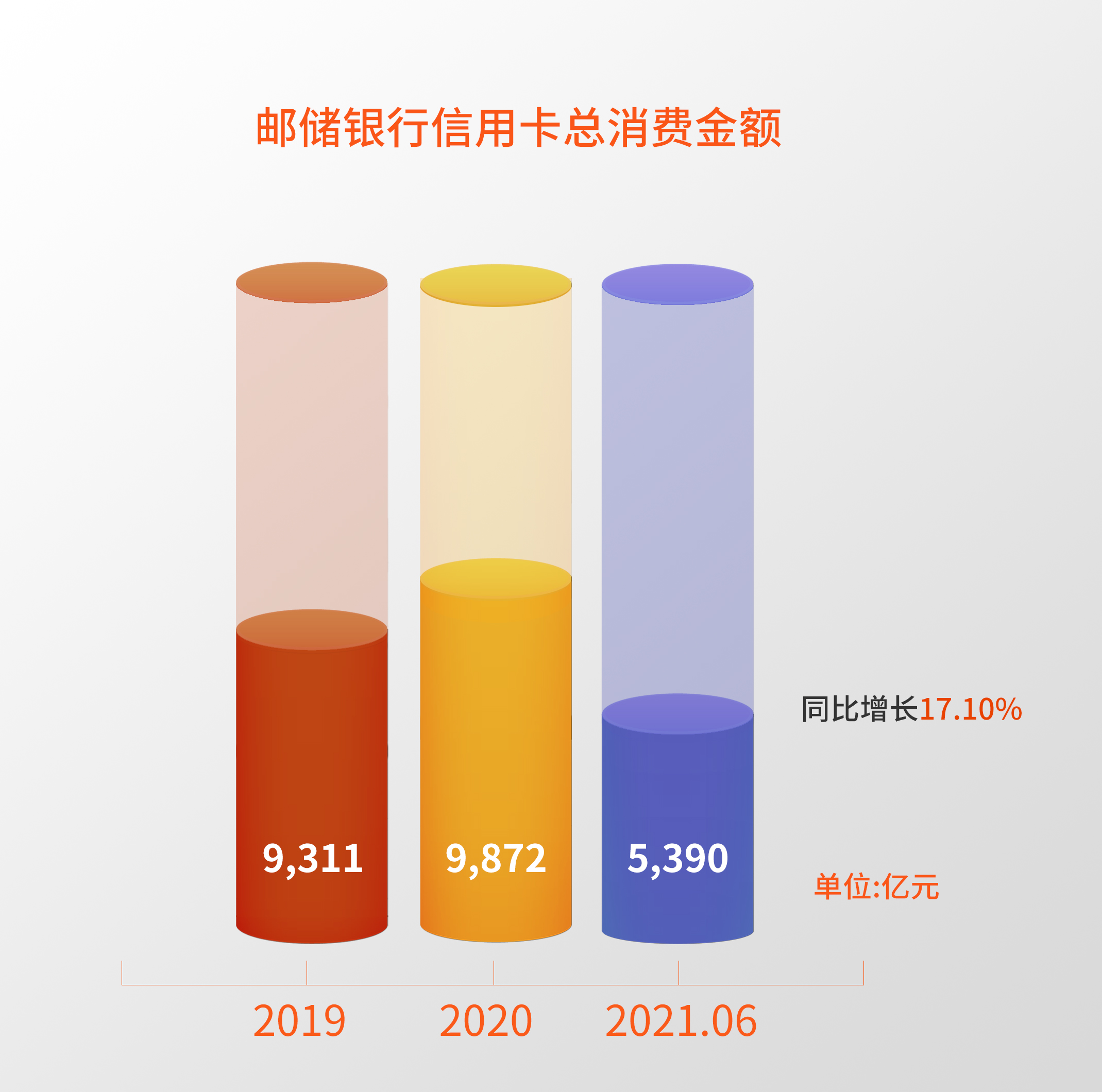 2021年上半年,邮储银行信用卡总消费金额5,389.81亿元,同比增长17.10%。