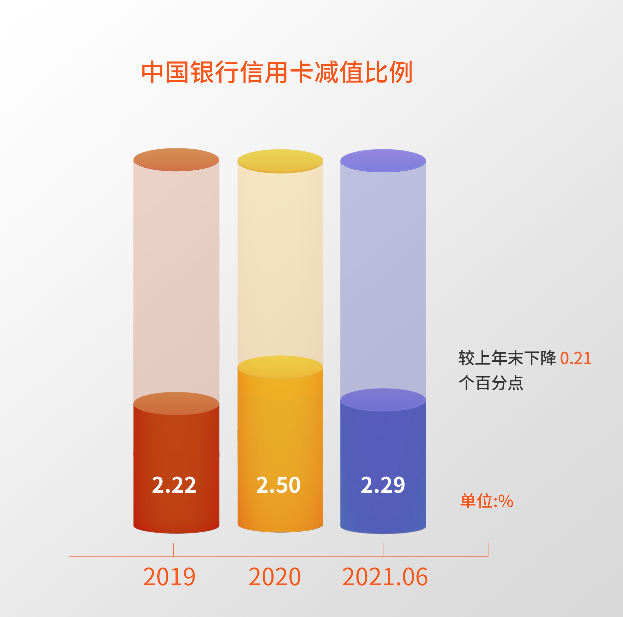 2021年上半年,中国银行信用卡减值比例2.29%,较上年末下降0.21个百分点。