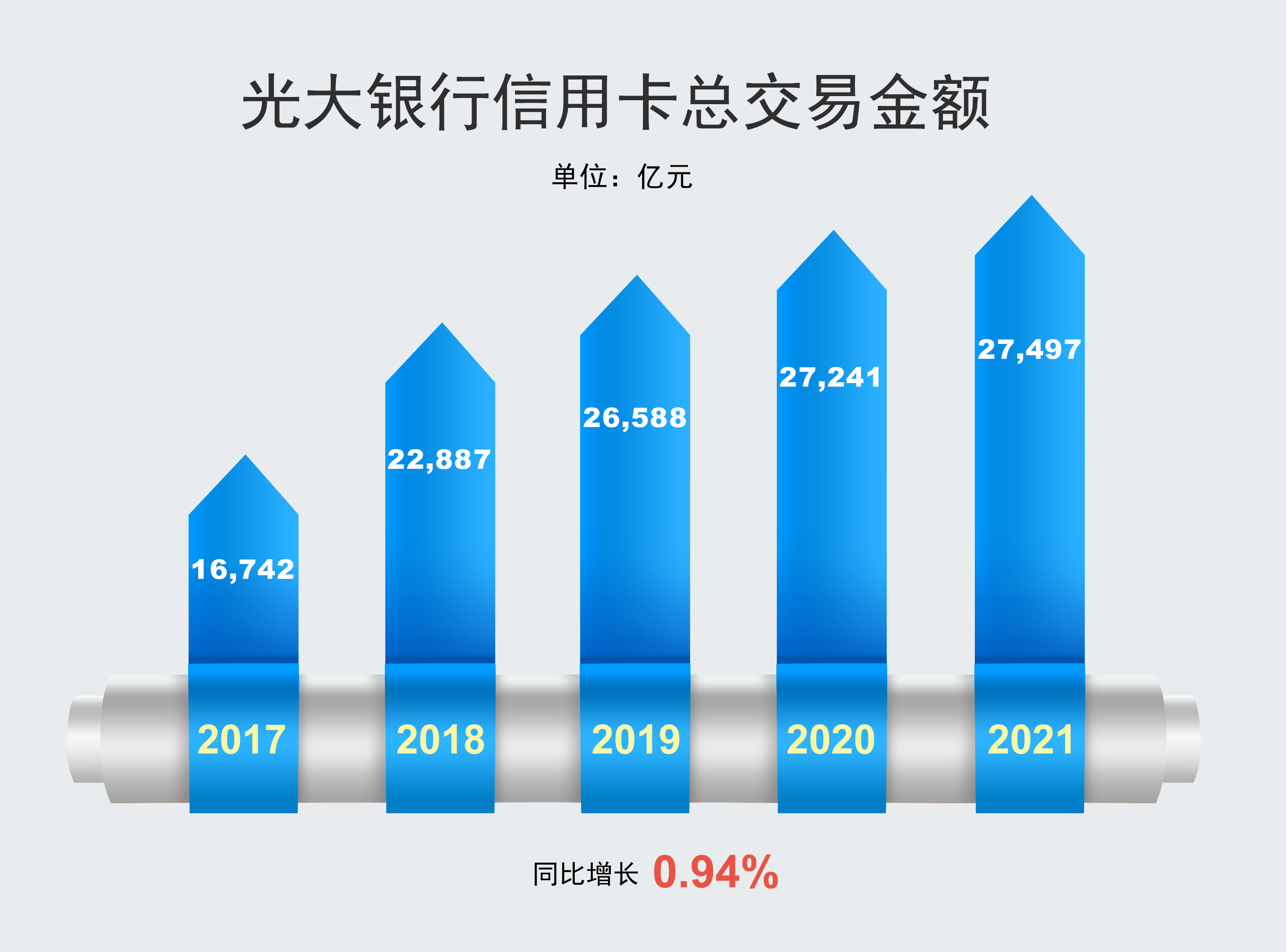 2021年,光大银行信用卡总交易金额27,497.41 亿元,同比增长0.94%。