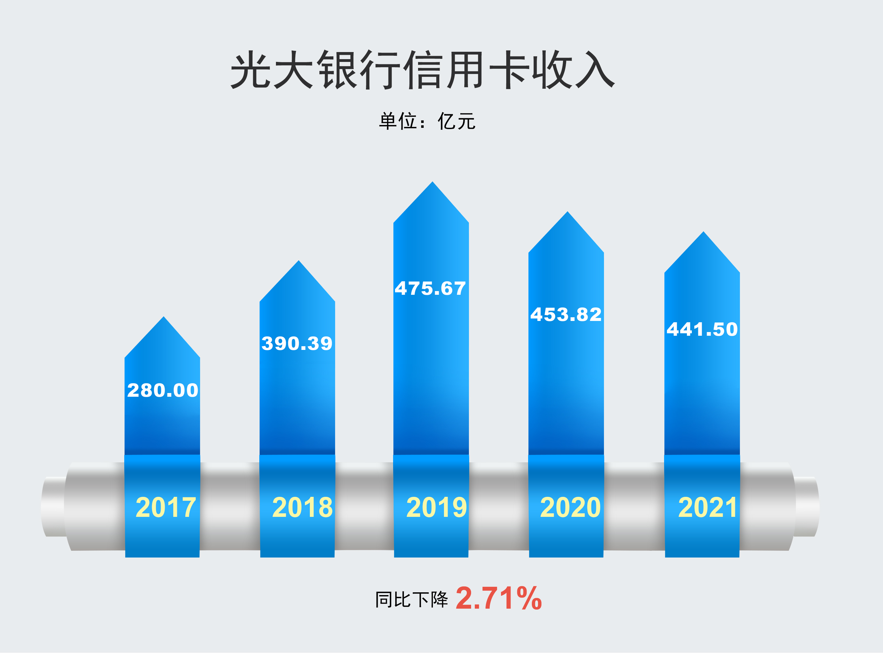 2021年,光大银行信用卡实现业务收入441.50亿元,同比下降2.71%。