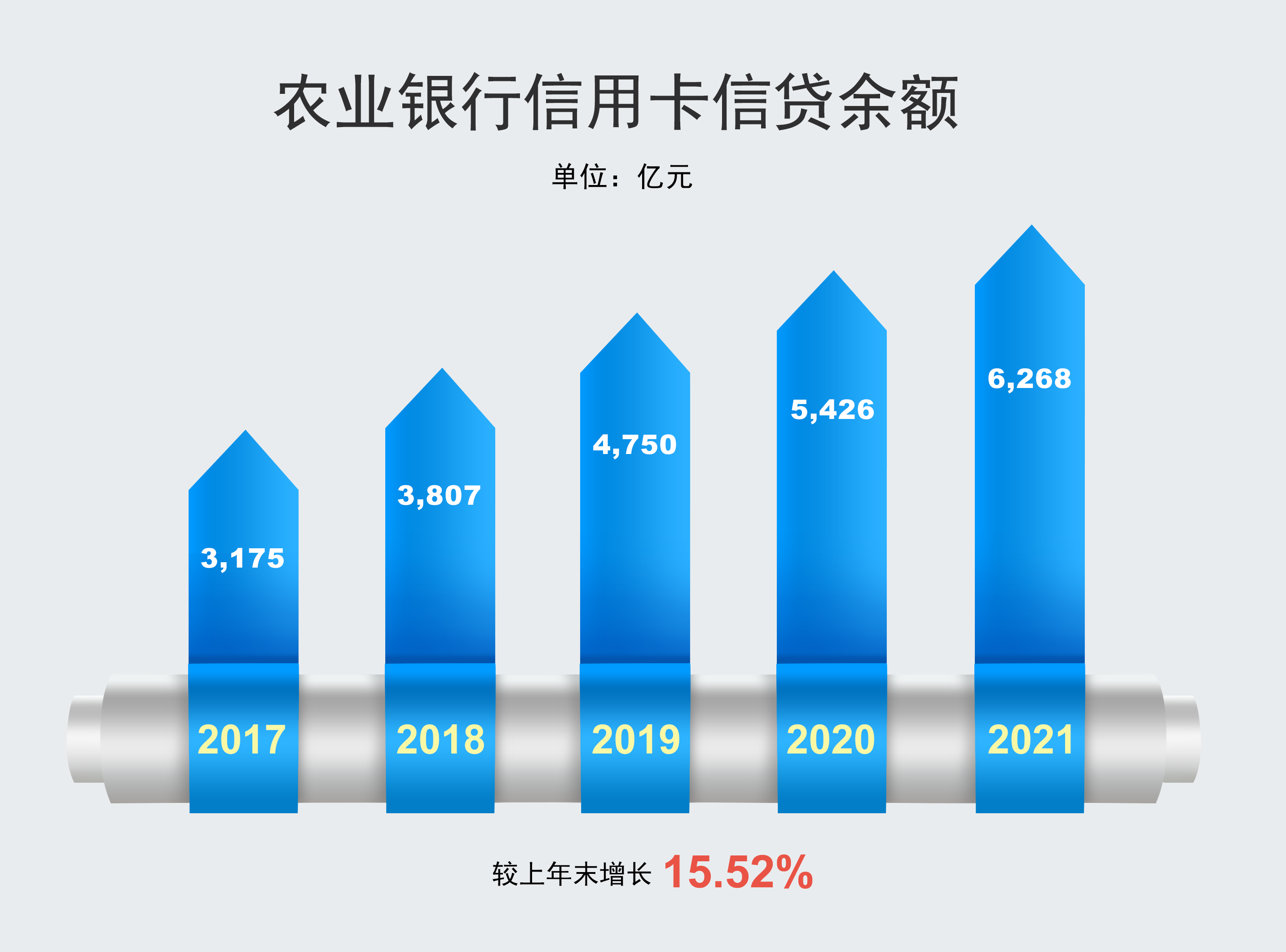 截至2021年末,农业银行信用卡信贷余额6,267.83亿元,较上年末增长15,52%。