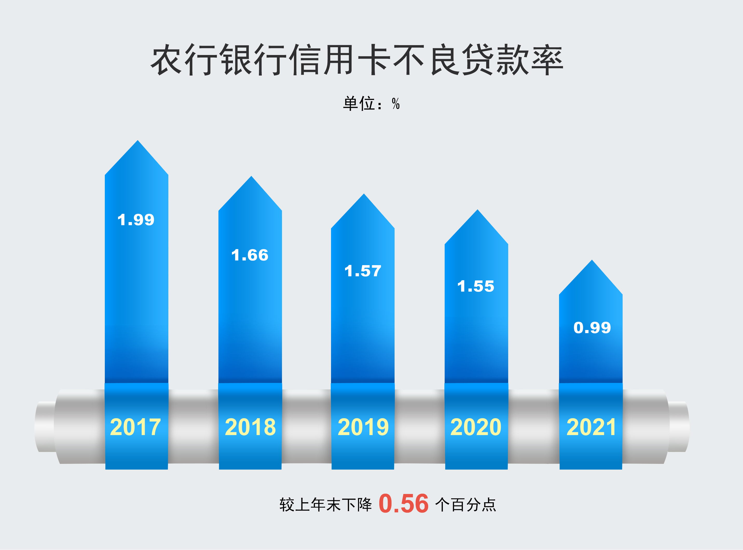 截至2021年末,农业银行信用卡不良贷款余额61.79亿元,不良率0.99%,较上年末下降0.56个百分点。