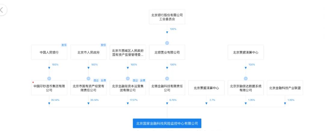 具体来看,国家金融科技风险监控中心由北京市国有资产经营有限责任公司(简称“北京国资公司”)、中国印钞造币集团有限公司、北京金融街资本运营集团有限公司(简称“北京金融街资本”)、北银金融科技有限责任公司(简称“北银金融科技”)、北京票据清算中心、北京金融科技产业联盟、北京京融信达数据系统有限公司(简称“北京京融信达”)7位股东共同持股。