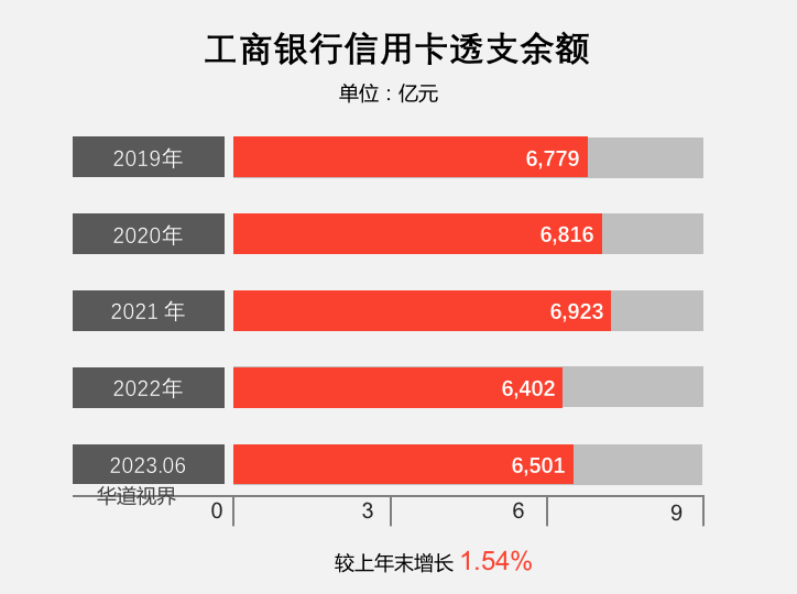 截至2023年6月末,工商银行信用卡透支余额 6,500.86 亿元;