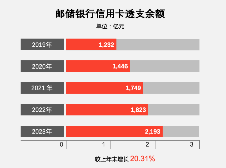截至2023年末,邮储银行信用卡透支余额2,192.80亿元,较上年末增长20.31%;