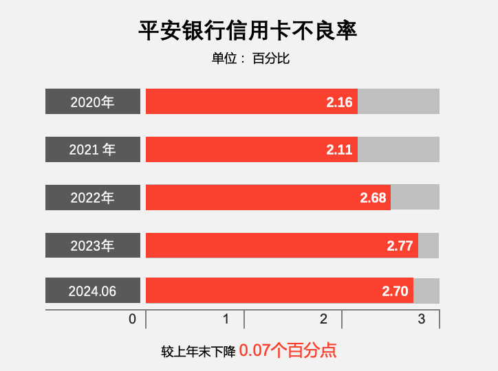 截至2024年6月末,平安银行信用卡不良率2.70%,较上年末下降0.07个百分点。