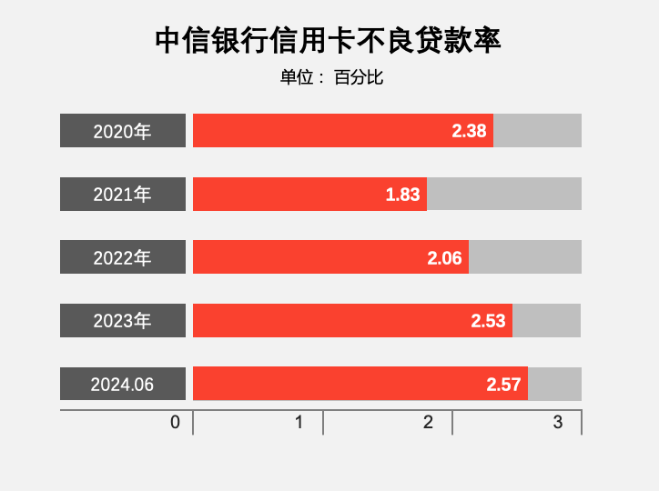 截至2024年6月末,中信银行信用卡不良率 2.57%;