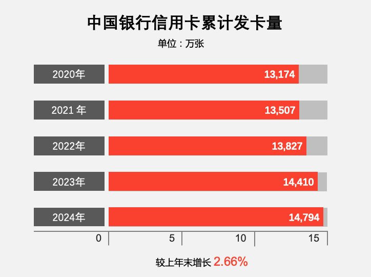 截至2024年末,中国银行信用卡累计发卡量14,794.04万张,同比增长2.66%;