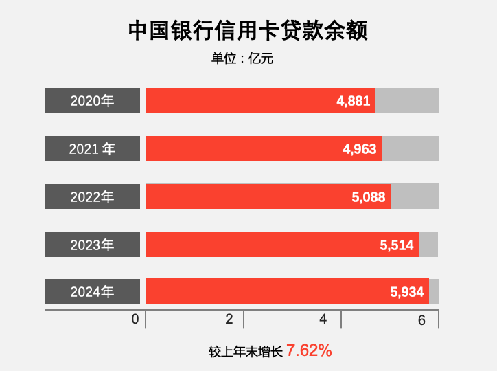 截至2024年末,中国银行信用卡贷款余额5,934.03亿元,同比增长7.62%;