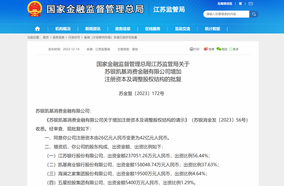 作者注意到,监管已于12月初批复苏银消金增资及股权调整申请,同意苏银消金注册资本由26亿元增加至42亿元,增资幅度超60%。