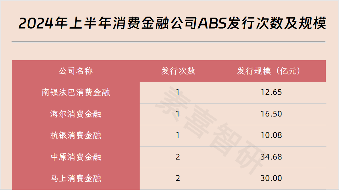 而根据作者统计,2024年上半年,共有5家消费金融公司发行了超百亿规模的ABS,分别为马上消费金融、中原消费金融、杭银消费金融、海尔消费金融、南银法巴消费金融,各消金公司及其发行次数、发行规模的统计如下图所示: