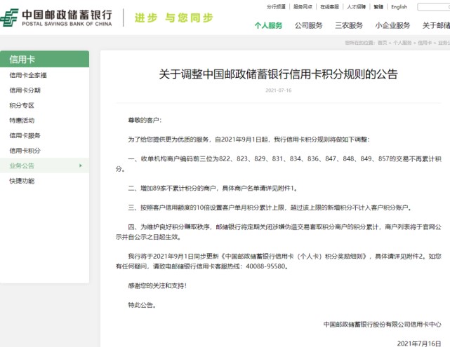 除此之外,今年已有多家银行主动调整信用卡积分规则,例如邮储银行于7月16日发布《关于调整信用卡积分规则的公告》表示,取消10家收单机构信用卡积分累计,增加89家不累计积分的商户,按照客户信用额度的10倍设置客户单月积分累计上限,超过该上限的新增积分不计入客户积分账户等。这是该行继今年2月1日调整信用卡积分规则之后的再次调整。