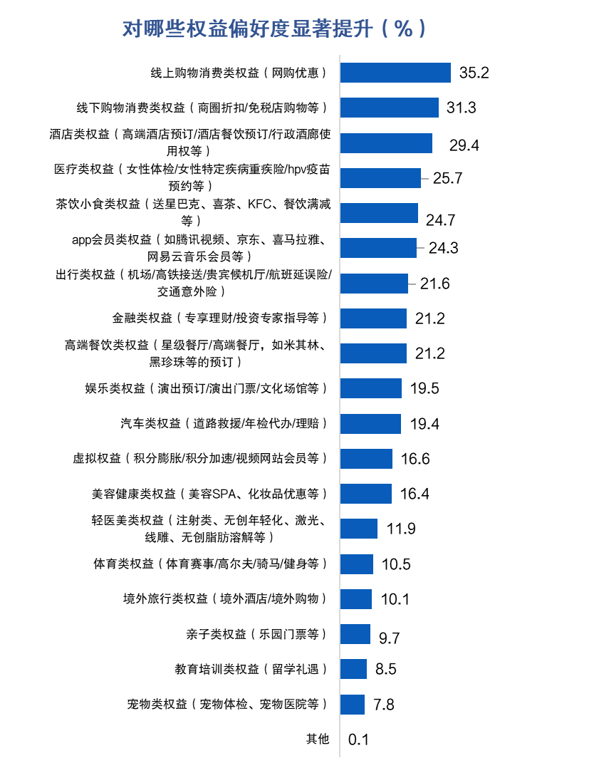 近年来陆续有银行推出信用卡会员体系,在持卡人体验方面,“太多重复权益”(29.8%)和“权益质量不高”(29.8%)是最大的痛点,紧随其后是“经常会遗忘或过期,也没有提醒”(27.7%)。中年、持有较高等级卡产品、拥有多张信用卡的持卡人更热衷参与会员活动。线上购物消费类权益最得人心,女性体检、女性特定疾病重疾险、HPV疫苗预约、癌症早筛等健康权益也愈加受到欢迎。