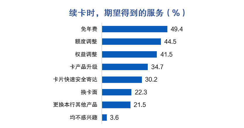 在续卡环节,超四成客户偏好通过短信发送的续卡提醒,其次是手机银行推送(38%)和银行官方微信公众号(35%)。在被问及“续卡时,您期望得到什么服务”时,近50%客户选择了“免年费”,同时,45%的客户表示希望能够调整额度,42%的受访者希望调整权益。