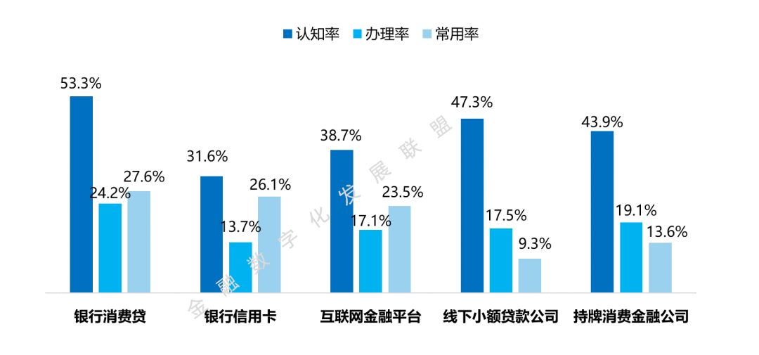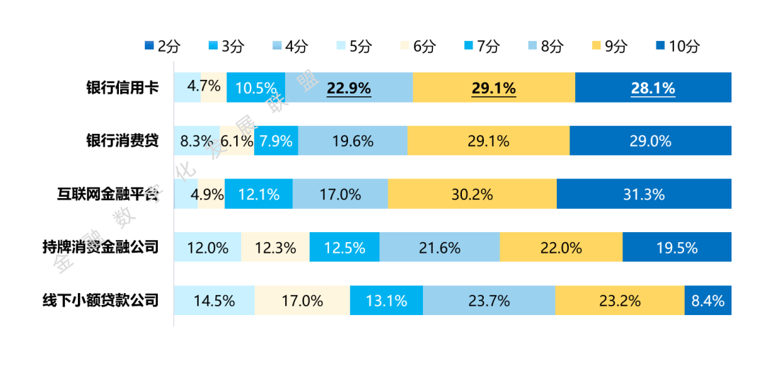 在城市层级维度,信用卡作为信用支付产品,在三线及以下城市的用户占比为35.5%,而现金贷产品和专项消费分期产品这一指标分别为24.8%、23.0%。信用卡专项消费分期产品中,三线及以下城市用户占比30.0%,银行消费贷业务中这一比例为21%。信用卡现金贷业务中,三线及以下城市用户占比为19.5%,依旧高于银行消费贷业务0.3个百分点。在用户认知维度,在信用支付产品上,银行信用卡的认知率与办理率均超80%,常用率为68.7%%,各项比例均显著高于其他机构。但对于现金贷、专项消费分期产品,信用卡的认知率仅为40.3%和31.6%,较银行消费贷分别低41.1和21.7个百分点;办理率分别为20.6%和13.7%,较银行消费贷分别低27.9和10.5个百分点;常用率分别为14.3%和26.1%,较银行消费贷分别低9.2和1.5个百分点。此外,值得关注的是,在通过信用卡办理专项消费分期的用户中,18-25岁客群占比高出消费贷6个百分点,一定程度上表明信用卡得到年轻客群的认可。图5:各类型机构现金贷产品的用户认知率、办理率与常用率图6:各类型专项消费分期产品的用户认知率、办理率与常用率在盈利能力维度,信用卡分期用户的平均年化利率为9.07%;在现金贷业务中,信用卡平均年化利率为7.45%,银行消费贷则为6.37%;在专项消费分期业务中,两者基本一致。信用卡业务的收入来源包括利息与非利息收入。根据上市银行年报中公开的信息,我国上市银行零售业务收益率集中在5%-6%,信用卡的收益率在零售业务中具有显著优势。在非利息收入方面,日常交易所带来的回佣收入可以大体弥补运营成本,在深化客户经营的趋势下,增值服务费、年费等成为银行新的收入增长点,且通常贡献非利息收入的用户资质相对更优,风险较小,业务盈利更为稳健。以上市银行为样本进行统计,2022年,国有大行零售业务收入及利润占全行的比重平均值分别为50%、46%,股份行为44%、36%,城商行仅为24%、27%,农商行为38%、42%,几乎都在50%以下,这表明我国银行零售转型的进程仍在继续,信用卡在提升零售业务收入与利润贡献方面具有重要意义。在用户体验维度,整体满意度上,银行信用卡客户为80.0%,较银行消费贷高出2.3个百分点;在场景丰富度的评价中,信用卡同样居于首位;在用户净推荐值表现上,信用卡为42.0%,银行消费贷则为40.3%。此外,相比非银机构,调研发现,偏好使用信用卡的用户比例(52.9%)较偏好使用互联网金融平台或持牌消费金融公司类信用卡的用户(32.1%)高21个百分点,这说明以信用卡为抓手,实现非银机构消费信贷用户的转化具有现实基础。在获客成本维度,信用卡线上、线下的获客成本约290元、234元,而专项消费金融产品线上、线下的获客成本则约328元、268元,银行信用卡线上、线下获客成本均低于专项消费金融产品。在零售融合经营维度,就办理过银行多个产品的用户来看,60%以上的用户都是在使用了该机构的信用卡之后,又去办理了该机构的现金贷或专项分期产品。当信用卡提供的现金贷的额度或期限无法满足需求时,80.4%的受访用户表示愿意申请发卡行其他现金贷产品。从职业分布方面,信用卡用户中经营者的占比高出银行消费贷5个百分点,而白领的占比则较银行消费贷低5个百分点,同时调研发现,对于办理过现金贷产品的经营者来说,超过半数的经营者出于申请繁琐、材料多、门槛高等原因不愿意申请小微企业贷,这表明如果银行能通过信用卡助力小微业务简化流程、改善体验,则有希望同步提升小微业务的发展空间。图12:不同类型机构用户职业分布-消费金融用户整体信用支付产品是消费金融机构实现客户引入的排头兵。以信用卡、类信用卡为代表的信用支付产品,具有免息期,同时凭借支付功能高频嵌入各类生活场景,用户基数广泛,产品理念容易被接受。因此,对于银行来说,信用卡是引入客户、特别是具有现实或潜在消费信贷资金需求的客户,并实现成长培养的有力抓手。针对银行来看,信用卡相比消费贷业务,其用户中三线及以下城市、经营者等下沉客群的占比明显更高。我国消费金融行业在经历了高速发展后,已步入相对成熟的规范发展阶段,市场竞争加剧,一线城市成熟度较高,各类机构均在探寻下沉市场发展空间。银行消费贷业务目前更聚焦于传统优质客户,如一、二线城市、白领客群,相比而言,信用卡是银行与其他机构抢夺下沉市场的有效载体。信用卡与消费贷的产品功能存在部分重合,不同银行对于两类业务的定位和经营战略也存在差异。2022年7月信用卡新规发布,对于现金分期业务,明确要求不得超过5万、2年,此项规定在一定程度上削弱了信用卡业务现金借贷产品的盈利贡献,引发部分银行关于信用卡和消费贷业务关系的思考。调研发现,66.2%现金贷用户的授信额度不超过5万、97.1%不超过24期。对于符合监管要求的现金类业务以及专项消费分期业务,如通过信用卡开展,好处在于用户侧的体验更佳,无需重复提交申请材料,同时前期获客成本较低,往期用卡数据的沉淀也为银行主动发现借贷需求、进行专项营销促动提供了基础。因此,以信用卡业务作为消费金融服务的主入口可能是更优选择,对于信用卡业务无法满足的需求,可以进一步引流至消费贷业务或是其他零售产品,但此种经营思路需要组织架构提供保障。从目前行业情况来看,多数银行同时设立信用卡部与消贷部门,在这种组织架构下,内部协同效率难免