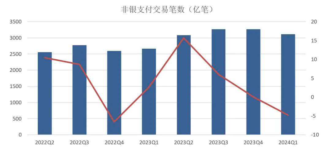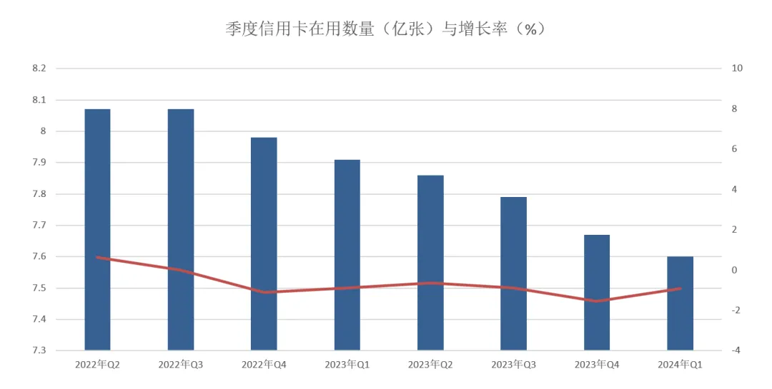 央行发布了《2024年第一季度支付体系运行总体情况》,截止到2024年第一季度末数量为7.6亿张,较2023年末的7.67亿张,环比下降0.91%。连续六个季度持续下降。