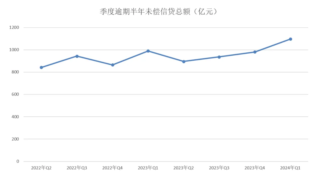 信用卡逾期半年未偿信贷总额1096.76亿元,环比增长11.76%,占信用卡应偿信贷余额的1.29%,首次突破千亿元大关,信用卡业务风险问题不容小觑。