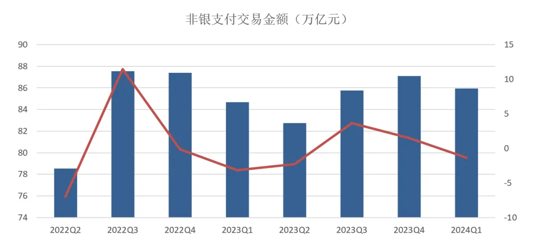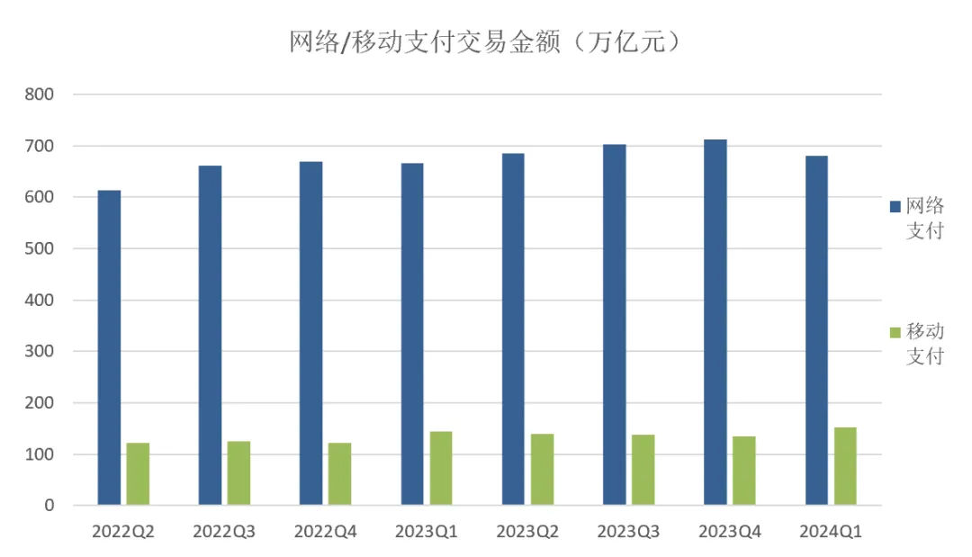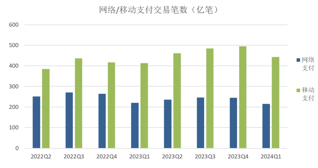 网络支付业务215.85 亿笔,环比下降11.94%,金额 680.11万亿元,环比下降4.39%;移动支付业务443.32 亿笔,环比下降10.24%,金额 152.07 万亿元,环比增长13.43%。