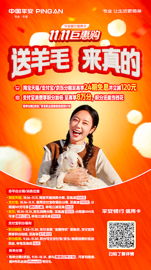 如今年的平安银行信用卡双11“巨惠购”活动,主题便是“送羊毛,来真的”,没有复杂优惠算法,摒弃各种促销话术,以简单明了的让利方式,给消费者带来分期满减、积分活动、分期优惠,主打一个“真诚简单”。