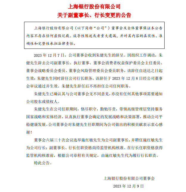 12月9日,上海银行发布公告称,因组织工作调动,朱健先生辞去副董事长、执行董事、董事会消费者权益保护委员会主任委员、董事会战略委员会委员、董事会风险管理委员会委员职务,该辞任自送达之日起生效;朱健先生同时辞任行长职务,该辞任于 2023 年 12 月 8 日经上海银行董事会审议通过并生效。朱健先生辞任后不再担任任何职务。