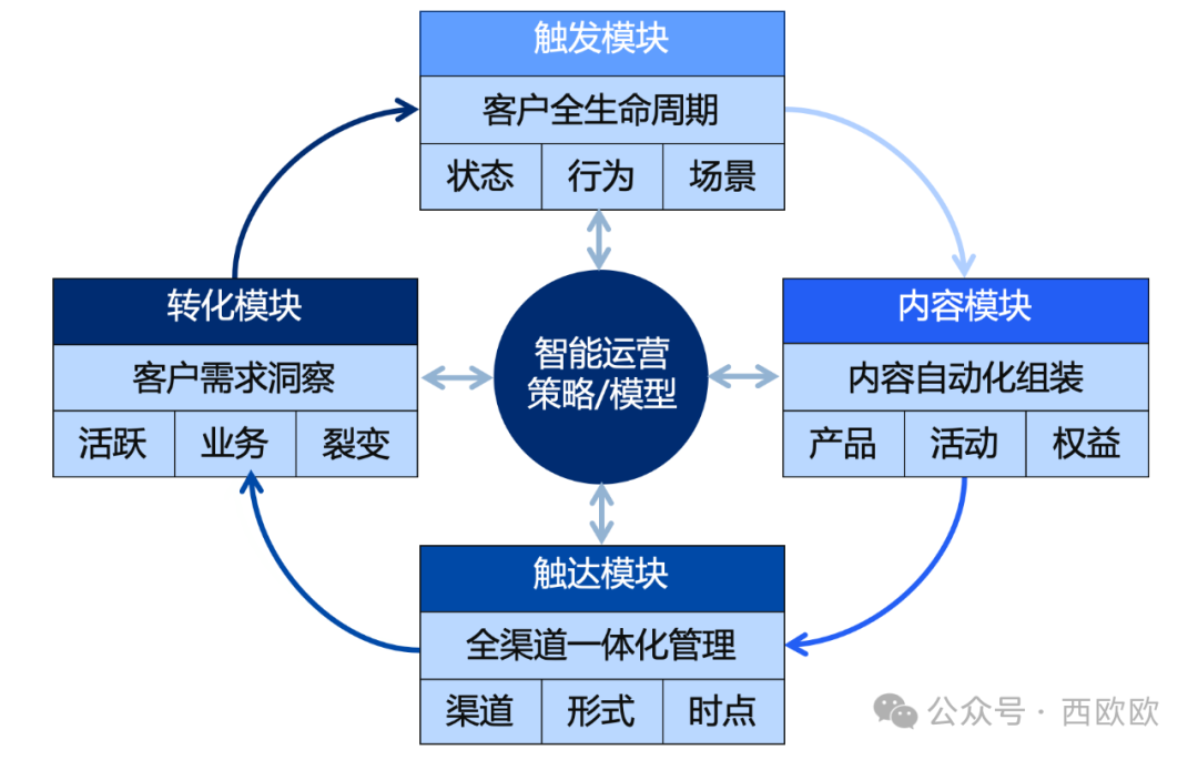 策略/模型模块:这是智能运营体系的核心,该模块通常基于A/B试验系统、自动化工具和AI技术进行搭建,能够为包括触发、内容、触达和转化在内的所有模块提供策略及模型支持,实现用户、渠道、产品和营销时点的精准自动连接,最大限度提升用户转化率。
