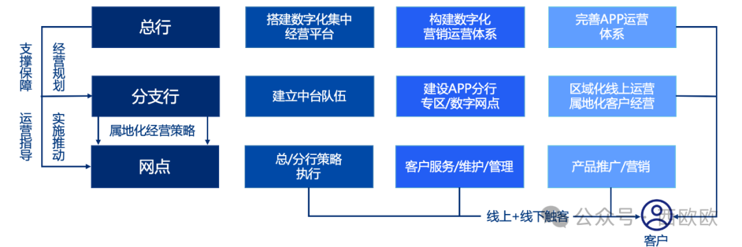 分支行:主要构建数字化经营能力,建立包括App线上运营人员、数据分析人员、商务拓展人员的中台队伍,通过运用总行营销资源、搭建APP分行专区与数字网点等线上平台,做好区域化线上运营与客户属地化经营,加强用户引流、促活、转化和经营。