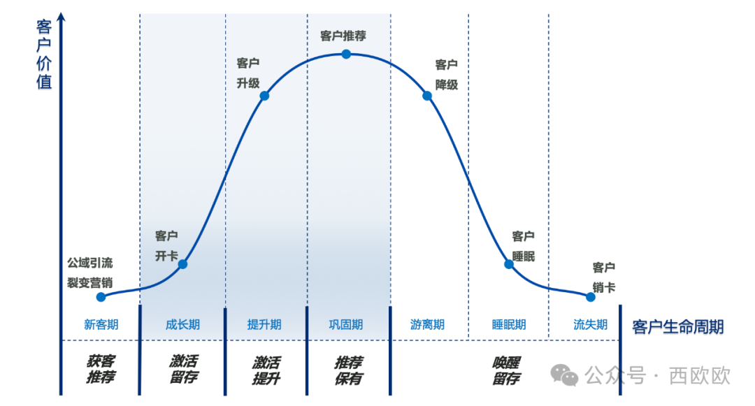 银行的客户生命周期中(下图),针对存量客户的经营动作主要集中在成长期、提升期和巩固期等三个阶段。