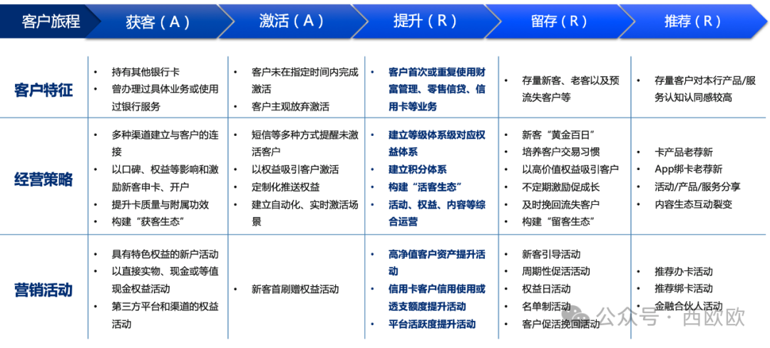 将互联网平台常用的AARRR模型与银行客户经营策略继续融合,就能得出一个银行客户经营的策略矩阵(下图),其中涉及处于不同阶段的客户的特征、相匹配的经营策略及营销活动,这其中可以重点关注与存量客户经营相关度最高的“提升阶段”。