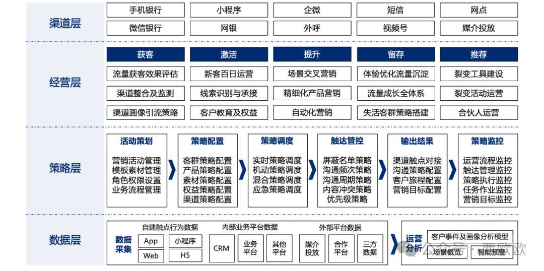 在上述这套经营策略的基础上继续扩展,即可得出银行的客户经营总体结构(下图),主要包括渠道层、经营侧、策略层和数据层等四个方面。