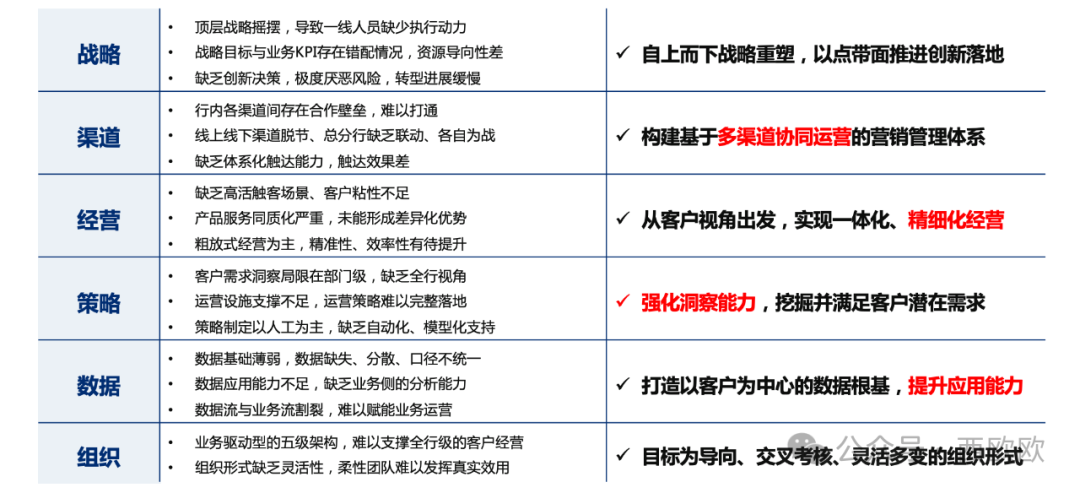 结合银行在存量客户经营所面临的诸多挑战(下图),各层面需关注的重点有: