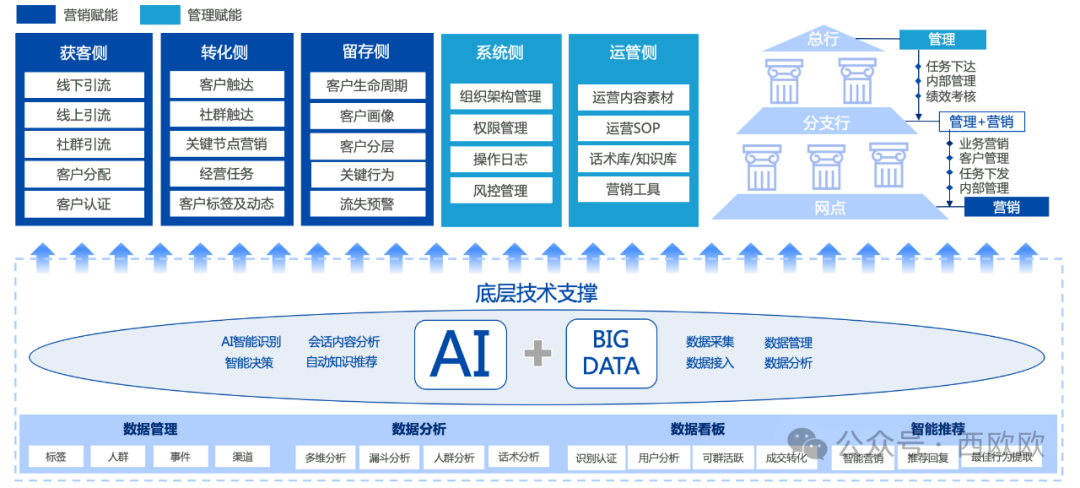 最后,我们来畅想下AI赋能银行客户经营的理想状态(下图),首先AI可以从获客、转化和留存等方面进行营销赋能,比如前文提到的客户洞察、精准营销等方面;其次还能从系统平台侧以及运营管理侧进行管理赋能,比如构建支撑智能运营所需的素材库、活动库、话术库、知识库等;再者就是对银行总分一体化战略的整体赋能,帮助总分支行更好地扬长避短,对终端的客户经理提供更为高效的工具及策略支持,从而实现客户价值最大化。