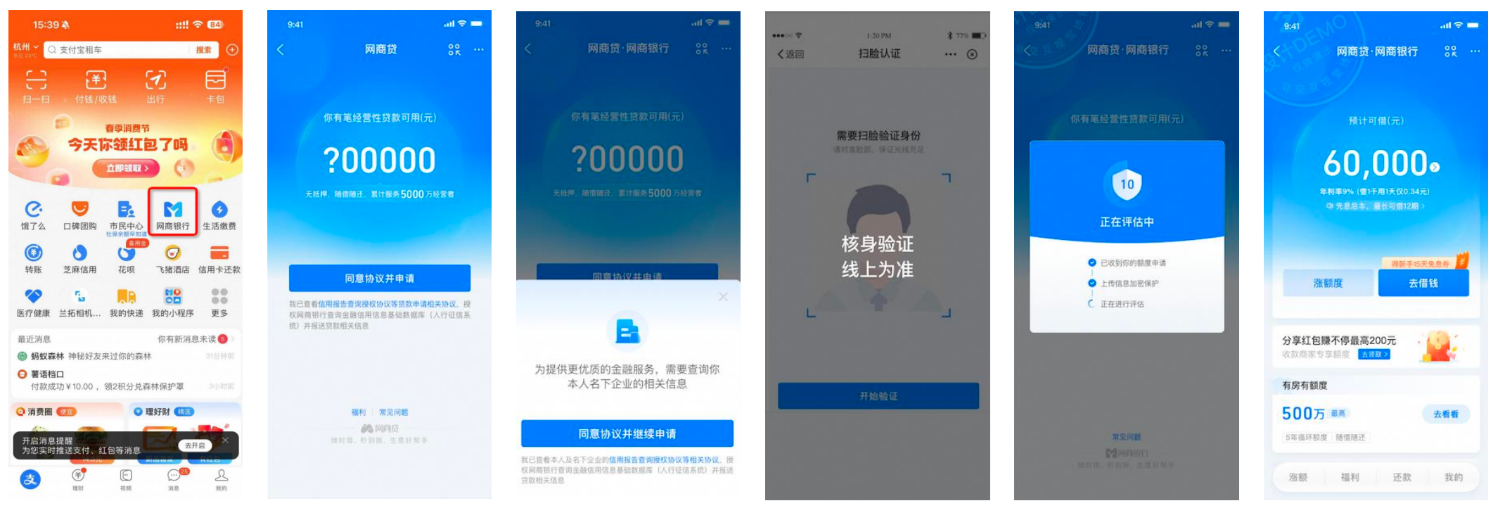 网商银行的「网商贷」属于第二种模式,客户在支付宝的「网商银行」入口,只需要3个步骤(点击网商贷-同意协议-完成人脸识别)即可完成额度审批。