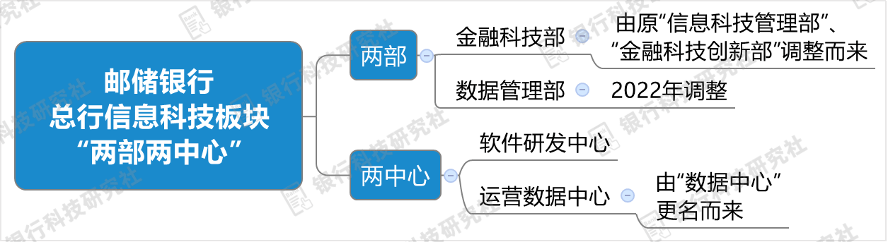 在此番调整之后,邮储银行总行信息科技板块由原来的“三部两中心”调整为“两部两中心”。