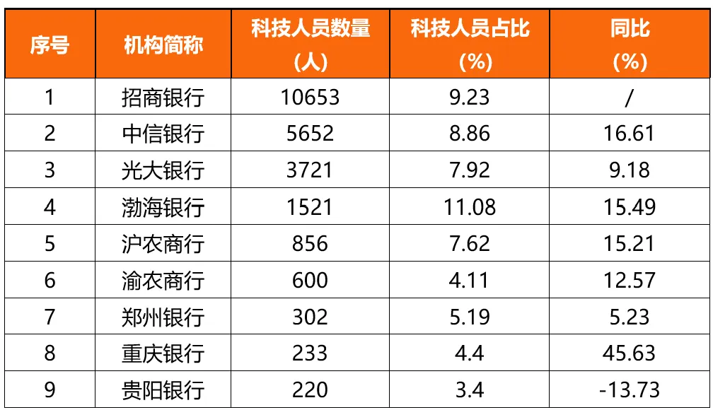 股份行中,光大银行和渤海银行科技投入占营收的比例均超过3%,其中,渤海银行达4.87%,且科技投入同比增长20.75%至6.4亿元。同时,渤海银行科技员工同比增长15.49%至1521人,占比达11.08%,为科技人员占比最高。