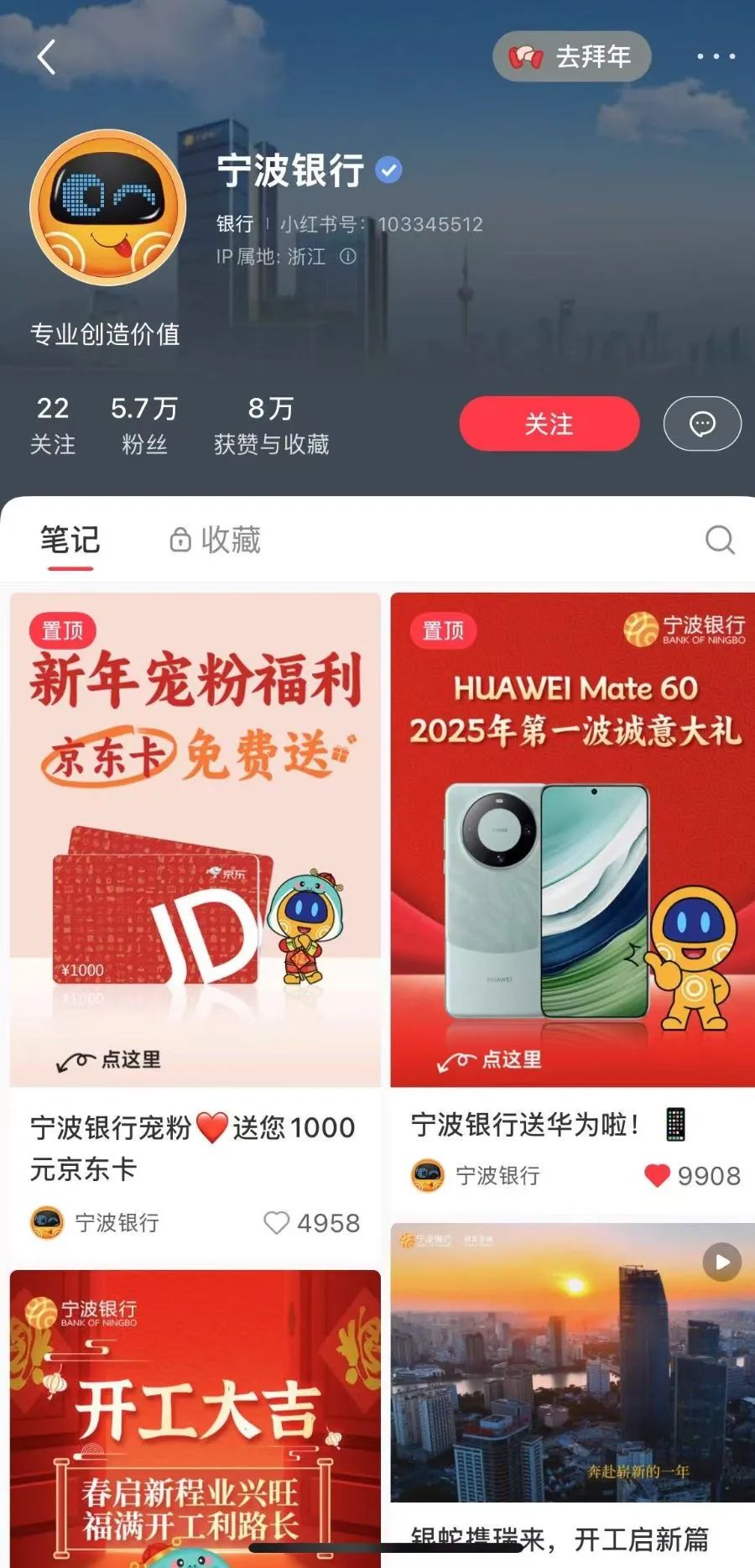 据了解,宁波银行计划2025年将小红书账号从当前的5.7万提升至10万-15万左右。“我们设定这个目标并未考虑到将流量变现,现阶段小红书对于大多数金融机构而言是一个‘种草’阶段,小红书的用户其实很反感简单粗暴或者是填鸭式的营销,他们更多看重的是获得情绪价值,能让他们觉得这个银行、这个产品不多,达到这个效果就很好了。”
