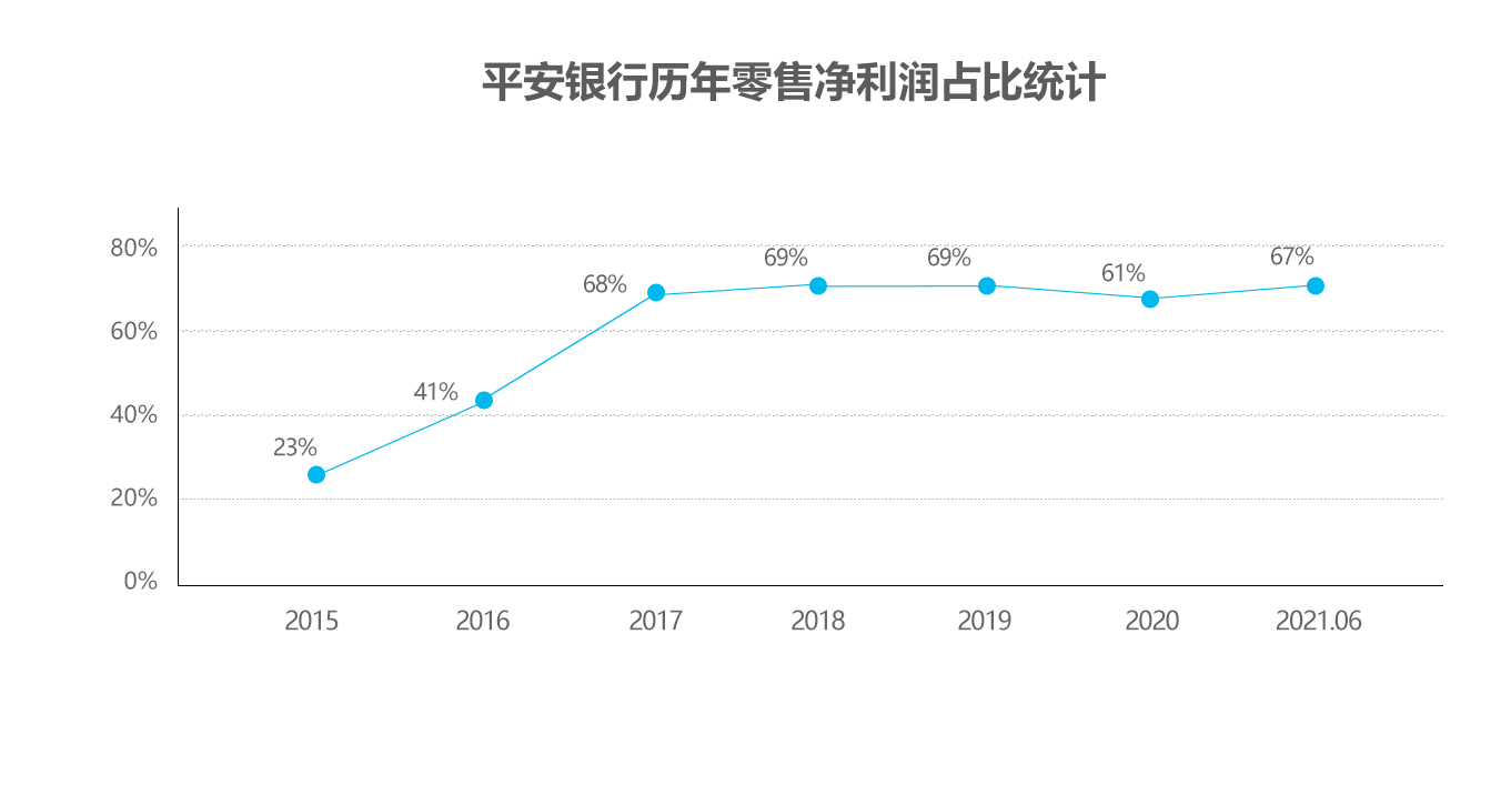 根据平安银行年报数据显示,2015年平安银行零售净利润为44亿元,2016年为93亿元,2017年为157亿元,零售净利润占比也从2015年的23%增长至68%。仅两年时间,平安银行零售净利润增幅高达256%,零售净利润占比也提高了超40个百分点,且后续持续稳定在60%以上。平安银行凭借其快速增长的零售业务,在业内被誉为“零售黑马”。