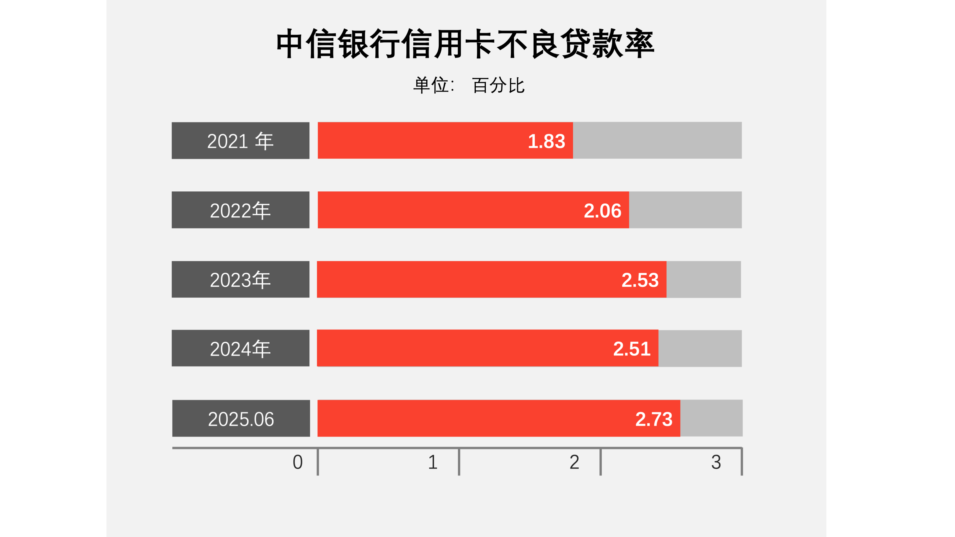截至报告期末,信用卡不良贷款余额125.16亿元,较上年末增加2.79亿元,不良率2.73%,较上年末上升0.22个百分点。