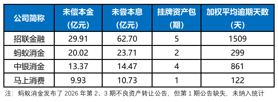 1月29日,蚂蚁消金发布2026年第2、3期不良资产转让公告,未偿本金20.0亿元,未偿本息23.7亿元,加权平均逾期天在280-320天之间,处于中等水平。