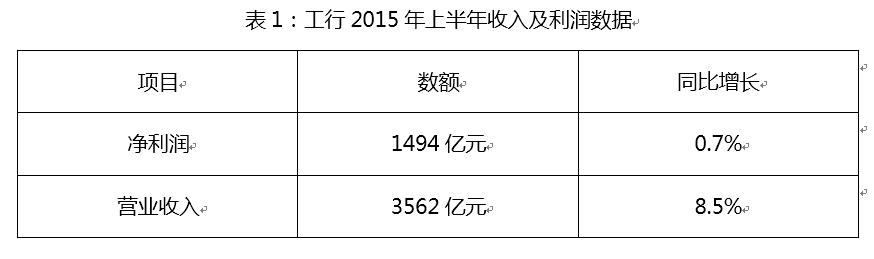 2015年8月28日,中国工商银行发布半年度业绩报告,根据工行半年度报告显示,该行的具体利润及收入数据如下表所示。