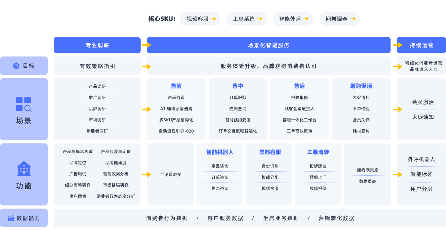具体涵盖购前行为数据洞察与需求建模,优化商品发现路径与导购体验;购中实时场景感知与精准服务触达机制,提升咨询转化效率;购后搭建智能化自助服务体系,实现售后流程自动化与服务效能提升